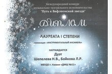 Лауреат 1 степени - Дуэт: Шепелева Наталья Владимировна, Бойкова Лейла Рашитовна (номинация "Инструментальный ансамбль).