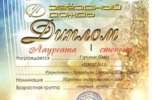 21-22 ноября 2015 г. в Казани прошел VI Международный фестиваль-конкурс детского и юношеского творчества «Звездный дождь». Поздравляем ученика ДМШ №11 Гурьянова Павла (гитара) с Дипломом Лауреата I степени.