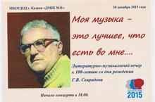 10 декабря в актовом зале ДМШ №11 состоится концерт, посвящённый 100-летию со дня рождения Георгия Васильевича Свиридова, выдающегося русского композитора 20 века, автора удивительно самобытной музыки, преисполненной огромной духовной силы и любви к родной земле.