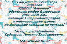 С 23 августа по 3 сентября 2018 года КДЮСШ "Авиатор" объявляет отбор фигуристов 2001-2005 г.р., имеющих 1 спортивный разряд, в тренировочные группы по фигурному катанию на коньках!
