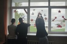 В преддверии празднования 79-й годовщины Победы в Великой Отечественной филиал колледжа принял участие, украсив окна праздничными надписями, тематическими картинками, на которых изображены символы Великой Победы: георгиевская лента, знамя, гвоздики, вечный огонь, белые журавли – символы памяти погибших на войне солдатах.