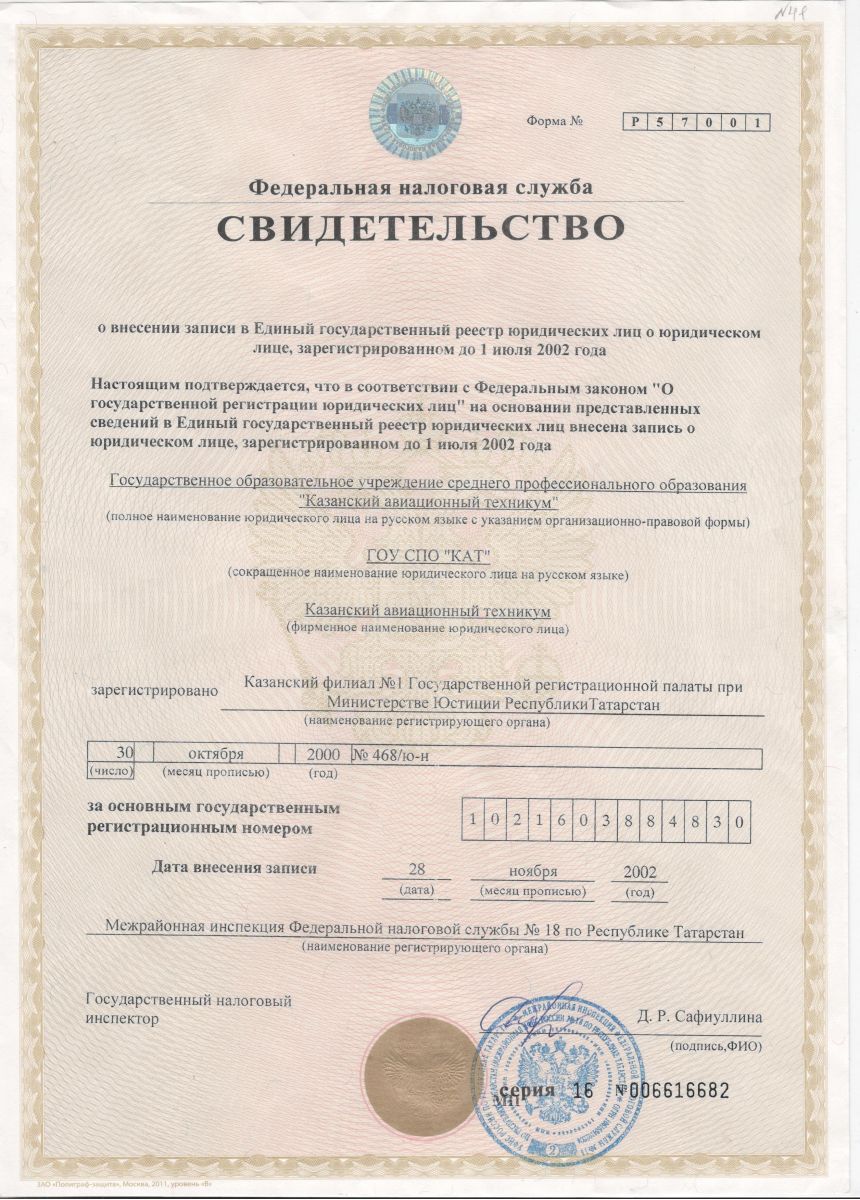 - Свидетельство о внесении записи в Единый государственный реестр