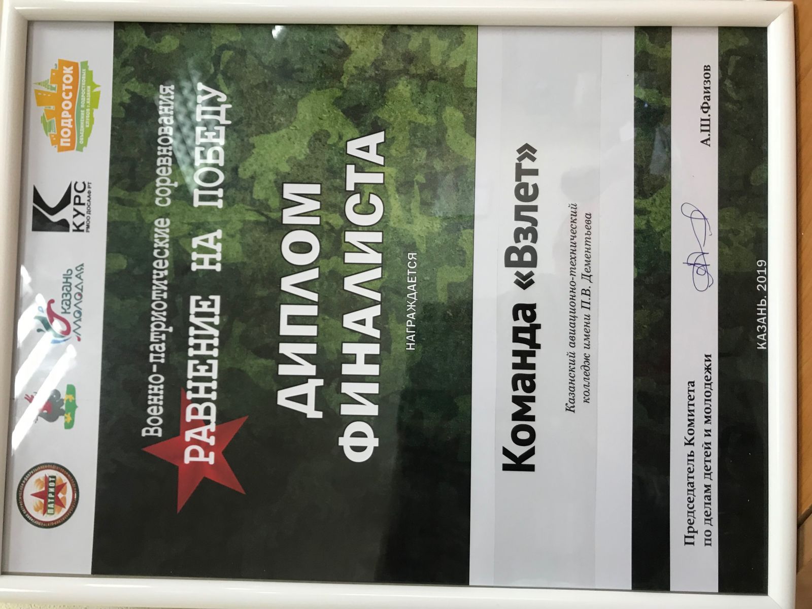 Опубликовано: 07.06.2019Команда «Взлет» КАТК им. П.В.Дементьева заняла почетное 2 место в Спартакиаде «Равнение на Победу!» - соревнованиях по военно - прикладным видам спорта среди детей и молодежи г. Казани ( старшая группа).