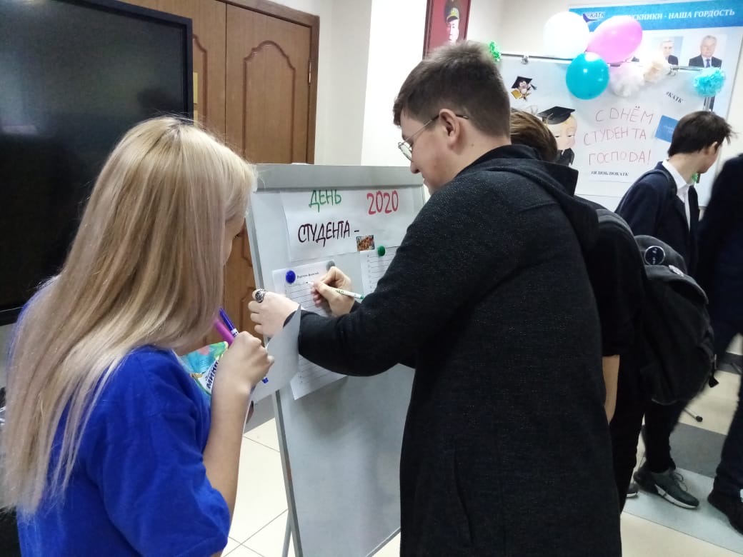 Так случилось, что именно сегодня студенты нашего колледжа отмечали этот праздник, провели флэш-моб, посвященный Дню студента. Ребята устроили танцевальный марафон, энергичные движения в ритм музыки дают позитивный настрой молодежи. Такие мероприятия в авиационном колледже являются доброй традицией и проводятся ко Дню студента каждый год. Организовывая их, учащиеся старших курсов поздравляют с этим праздником первокурсников и принимают новичков в свой дружный коллектив. В Татьянин день поздравляют всех студентов, а заодно и преподавателей, это отличный повод устроить фотосессию с преподавателями.
