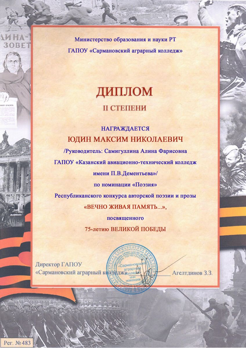 - Поэзия – Юдин М., гр. 17Л1, стихотворение собственного сочинения «Руины Мира», диплом II степени (руководитель Самигуллина А.Ф.);