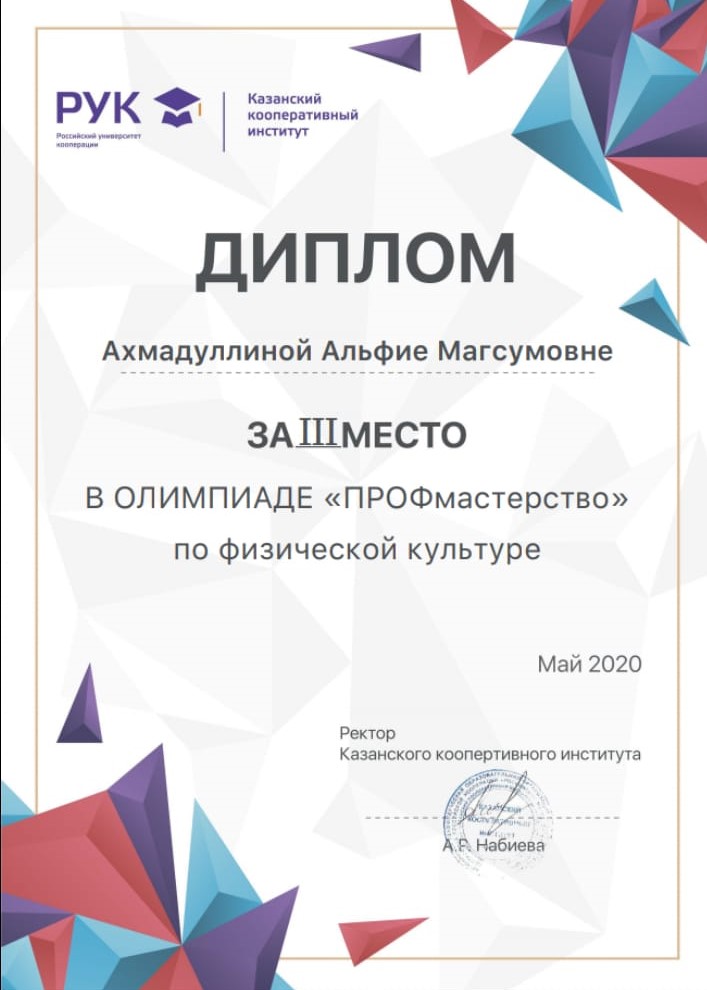Опубликовано: 08.05.20208 мая 2020 года состоялась дистанционная Олимпиада «ПРОФмастерства» по физической культуре, где студентка нашего колледжа Ахмадуллина Альфия, группа 18Т1, под руководством преподавателя Латыповой Эльмиры Рифкатовны приняла участие и заняла призовое III место.