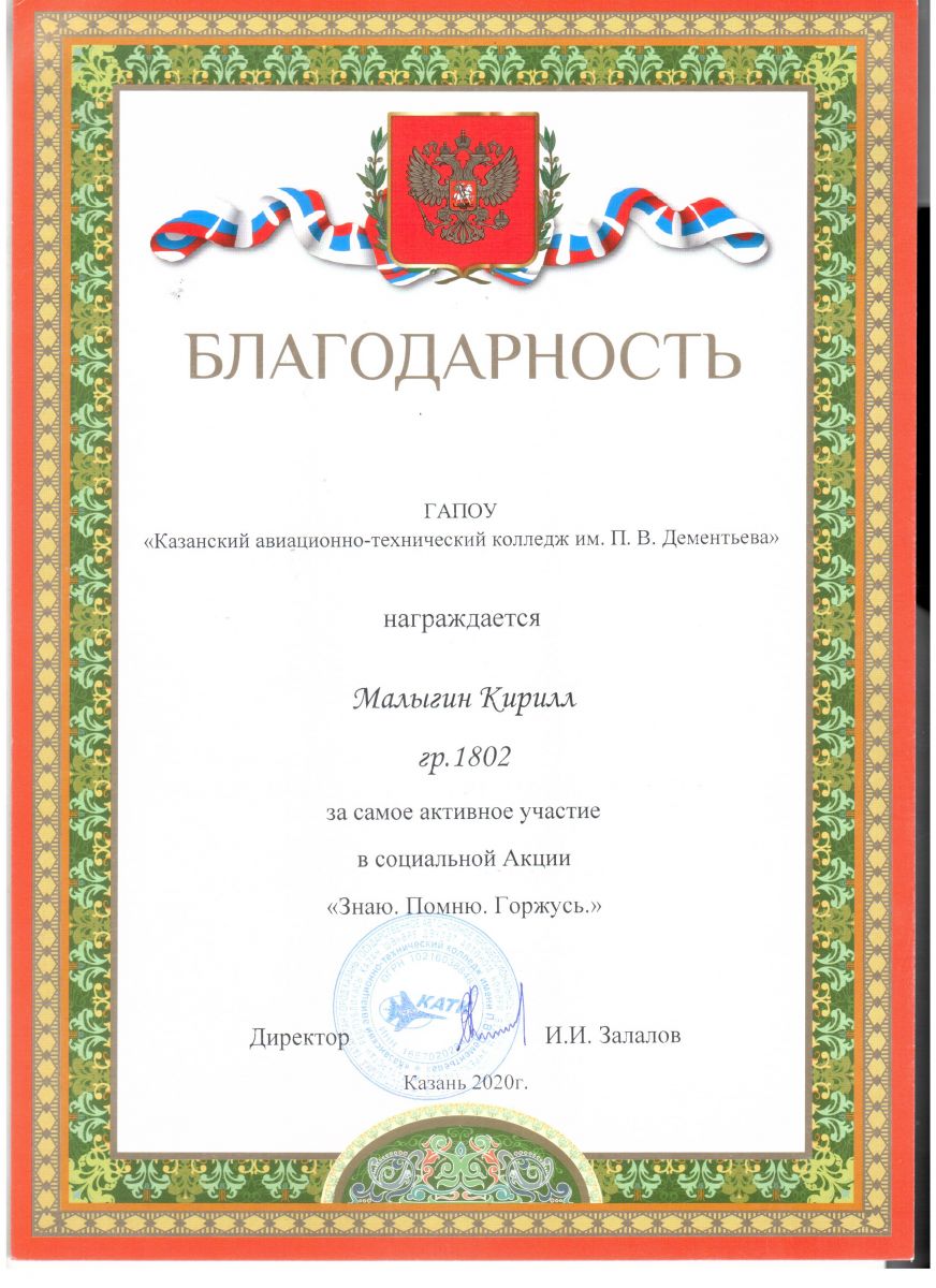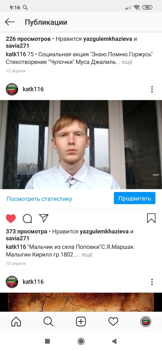 Опубликовано: 25.05.2020В преддверии 75-годовщины Победы в Великой Отечественной войне Республиканский центр спортивно –патриотической и допризывной подготовки молодежи «Патриот» запустил социальную акцию «Знаю.Помню.Горжусь», в котором приняли активное участие наши студенты. Для этого они сняли на видео стихотворение, посвященное Великой Победе,и выложили в социальные сети Инстаграм katk116 c хештегами #ЗнаюПомнюГоржусь, #75годовщинапобеды.
