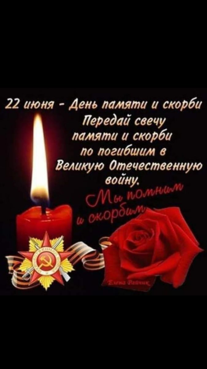 Опубликовано: 22.06.202022 июня - Памятная дата России: ДЕНЬ ПАМЯТИ И СКОРБИ. Установлен Указом Президента РФ от 8 июня 1996 года в память о погибших в Великой Отечественной войне. Отмечается в день начала Великой Отечественной войны (1941 год), когда немецко-фашистские войска вторглись на территорию СССР. В этот день на территории Российской Федерации приспускаются государственные флаги.