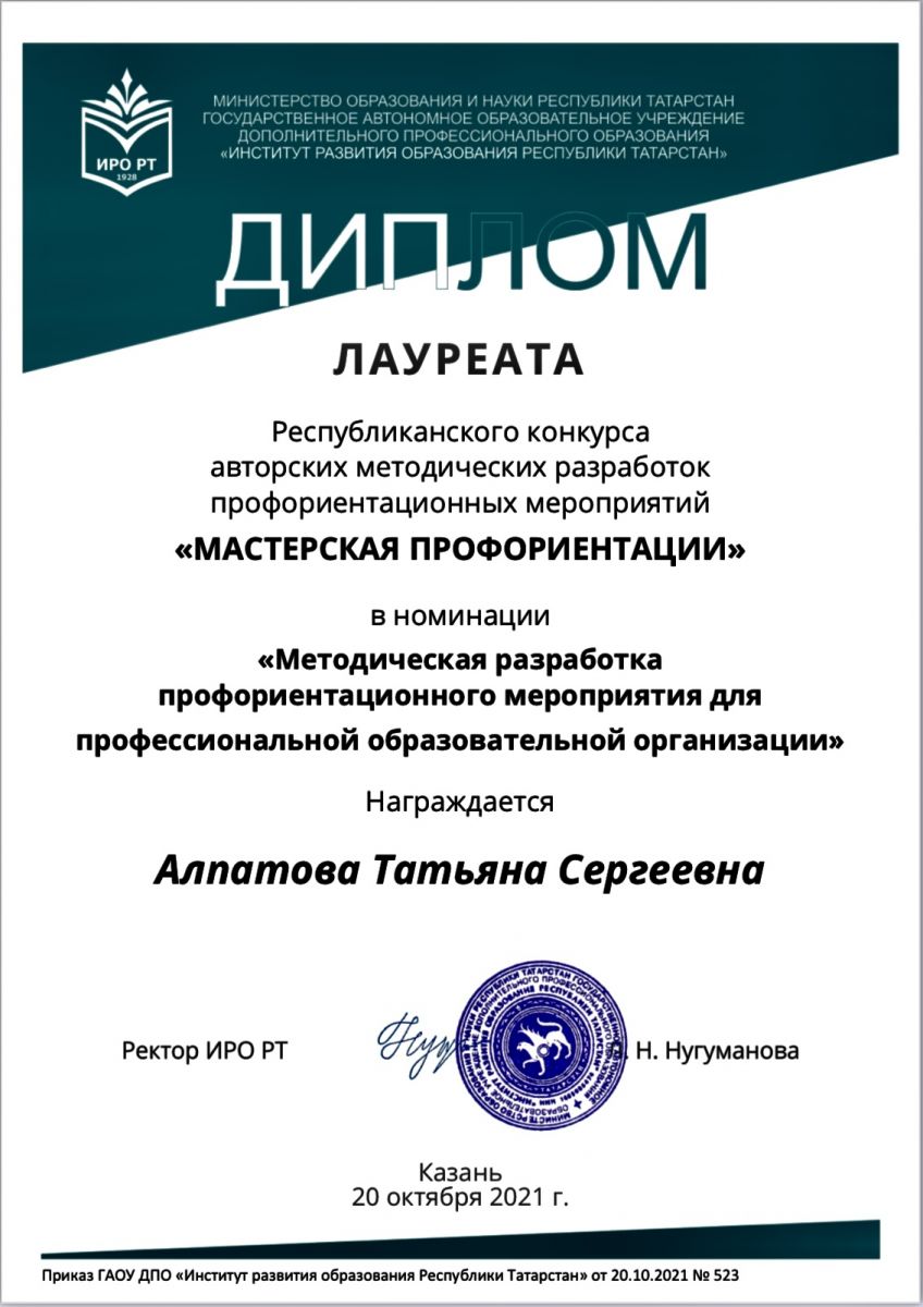 Опубликовано: 22.10.2021В колледже проводится активная работа по разработке новых методов профориентации. В связи этим, колледж принял участие в мероприятии «Института развития образования РТ»- в республиканском конкурсе авторских методических разработок профориентационных мероприятий «Мастерская профориентации» и был удостоен «Диплома Лауреата».