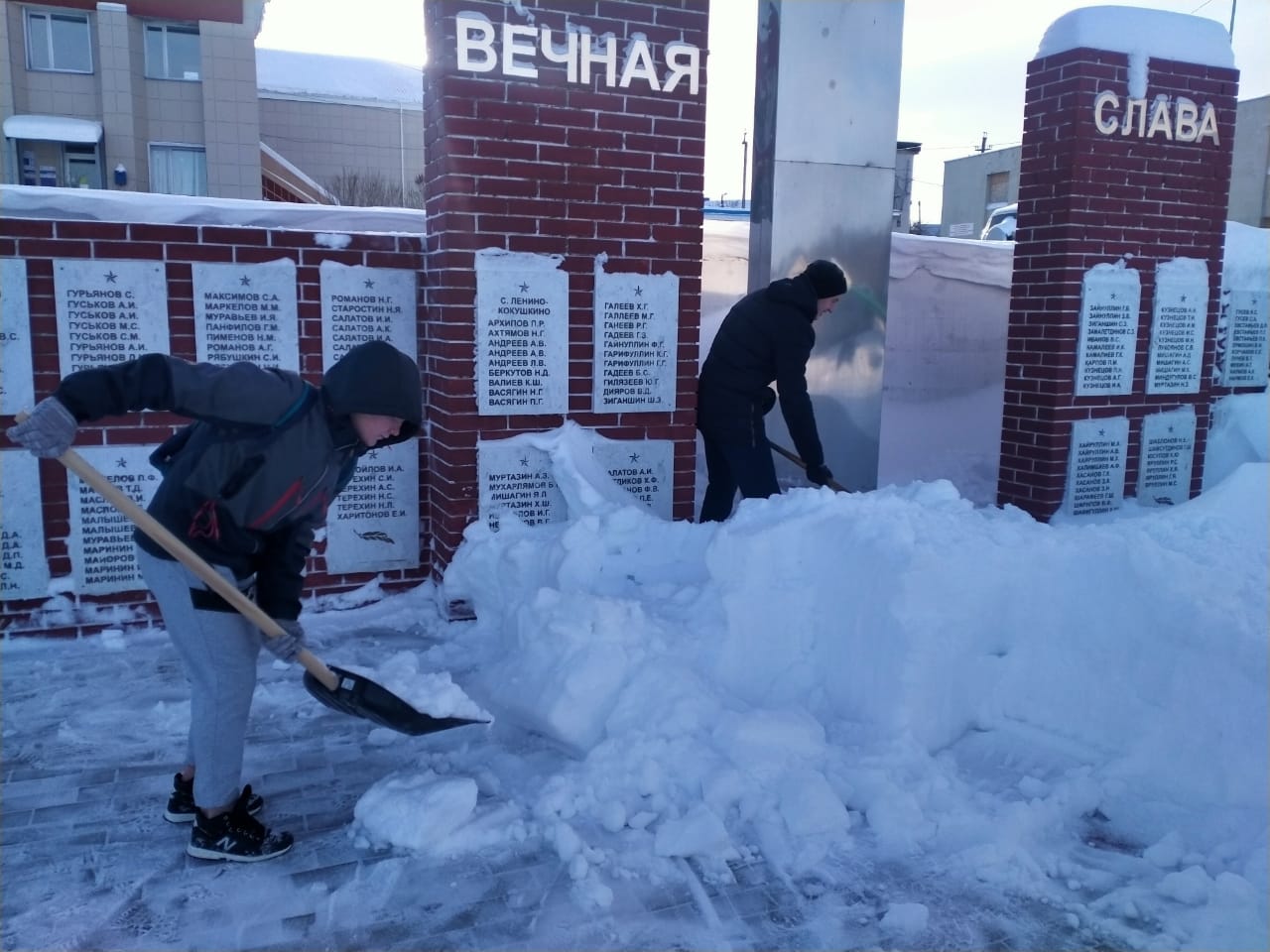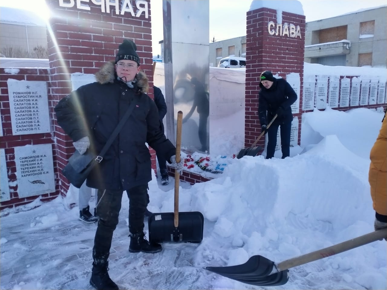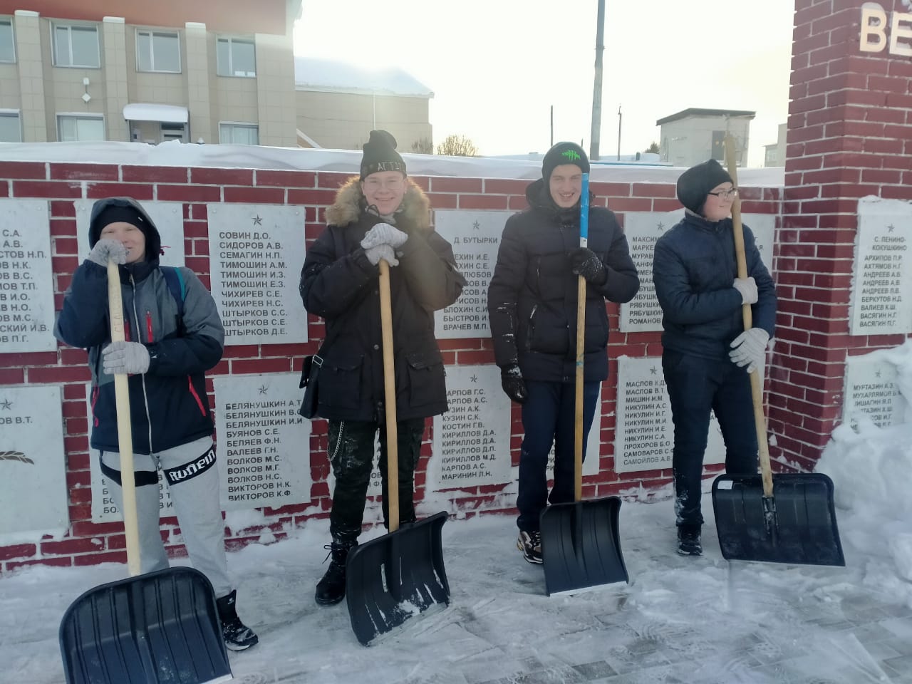 Студенты филиала колледжа Макаров Даниил, Азизов Расим, Гайнутдинов Ильдар, Гуменюк Владислав организовали очистку памятника павшим воинам в Великой Отечественной войне от снега на территории сельского поселения.