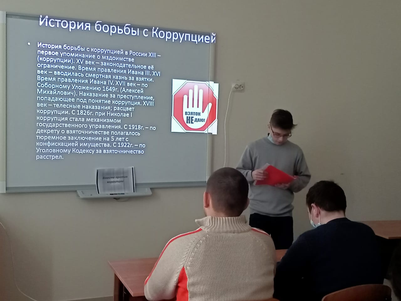 Опубликовано: 24.01.202224 января в группах 3 здания были проведены классные часы антикоррупционной направленности на темы: «Причины коррупции, пути их преодоления», «Взятка - средство (лёгкого) решения вопроса или преступление?», «Мировой опыт борьбы с коррупцией», «Борьба с коррупцией как вызов времени.