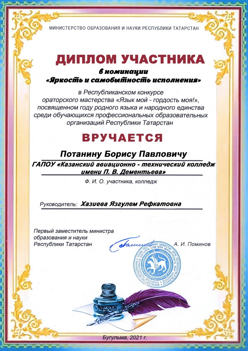 Опубликовано: 16.02.202224 декабря 2021 года был проведен Республиканский конкурс ораторского мастерства «Язык мой - гордость моя!», посвященный году родного языка и народного единства среди обучающихся профессиональных образовательных организаций Республики Татарстан. В Конкурсе приняли участие 74 работы обучающихся следующих профессиональных образовательных организаций Республики Татарстан.