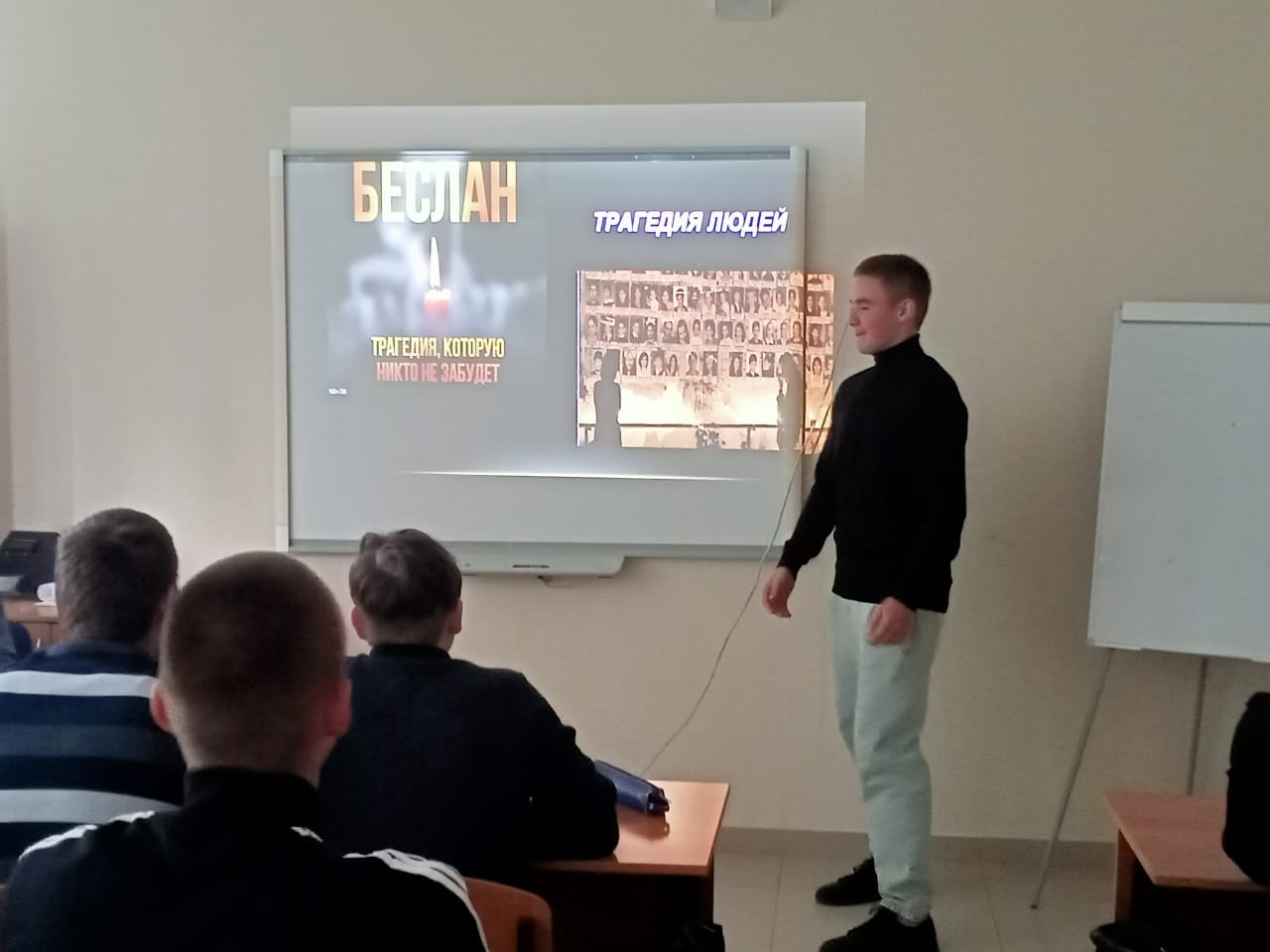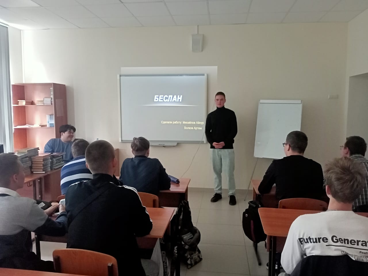 Также, классный час на тему: день памяти Беслана, проведен с целью сформировать у студентов представление о терроризме как историческом и политическом явлении: акцентировать внимание на необходимости проявления бдительности для профилактики совершения террористических актов, содействовать формированию толерантности и профилактике межнациональной розни и нетерпимости, содействовать формированию чувства милосердия к жертвам терактов Беслана и др.