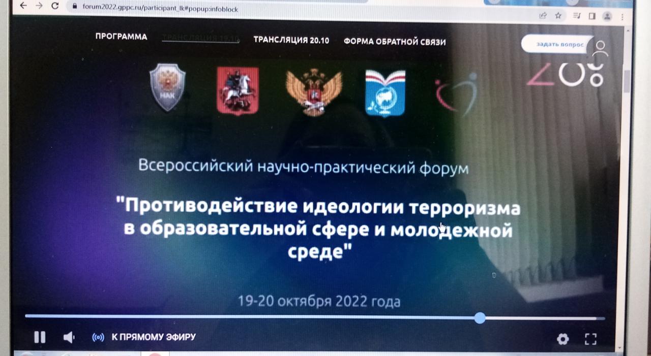 Опубликовано: 19.10.202219 и 20 октября 2022г. педагоги-психологи колледжа приняли участие в Всероссийском научно-практическом форуме «Противодействие идеологии терроризма в образовательной сфере и молодежной среде».