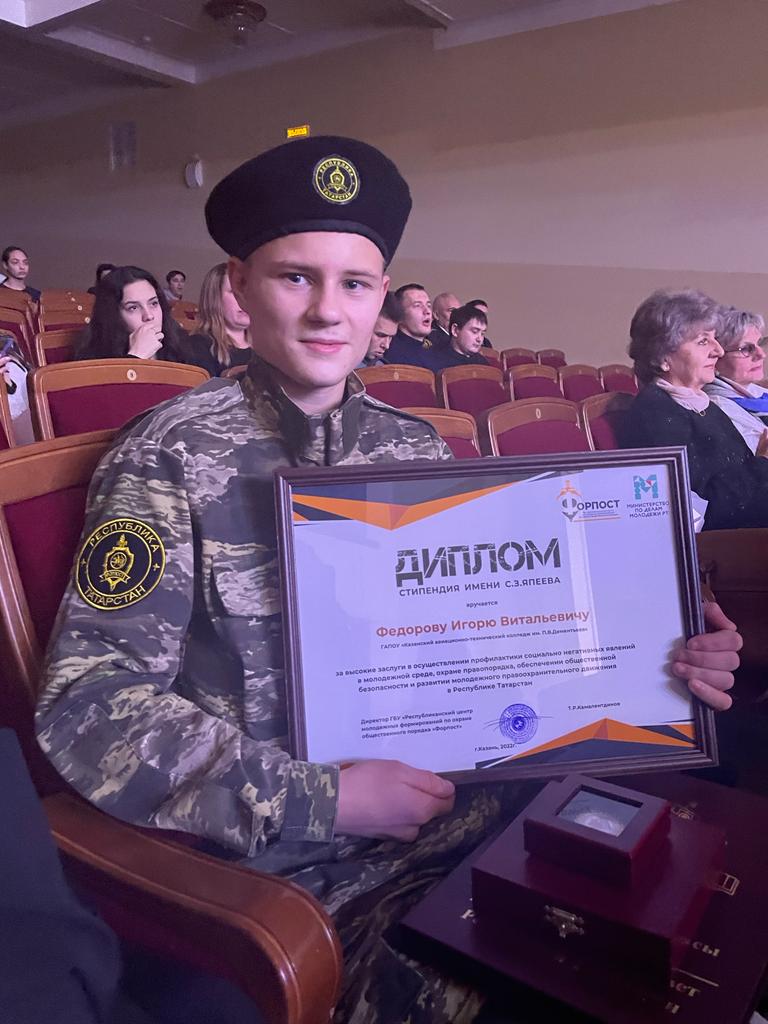 Опубликовано: 15.12.2022Командир молодежного отряда «Форпост» Федоров Игорь, студент филиала ГАПОУ «Казанский авиационно – технический колледж им. П. В. Дементьева», стал стипендиатом ежегодной премии имени Салиха Япеева Министерства по делам молодежи Республики Татарстан