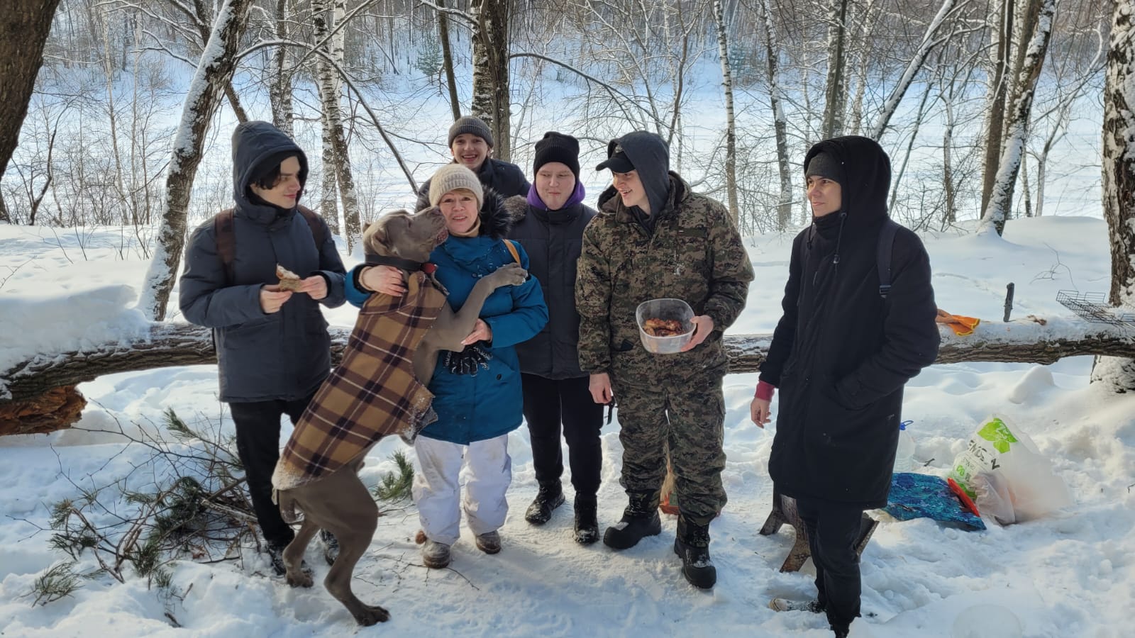 Чистейший воздух, хрустящий под ногами снежок, легкий морозец разрумянили щеки ребят и создали отличное настроение. Длинную дорогу ребята и не заметили, так как мы соревновались в скорости шагов. А поскольку с нами была еще и собака, они играли с ней, бросая ветки и заставляя ее приносить их.