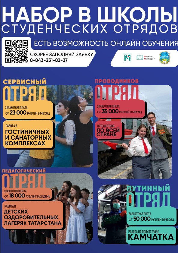 Обучение в образовательных организациях высшего образования и среднего профессионального образования Республики Татарстан в 2023 году запланировано по 4 направлениям: «Школа вожатого», «Школа проводников пассажирских вагонов», «Школа сервисных отрядов», «Школа путинных отрядов», длительность обучения составляет 2,5 месяца. Обучение будет осуществляться в очном и очно-заочном форматах. В конце Обучения проводится итоговая аттестация обучающихся, по итогам которой выдается сертификат о прохождении курса.