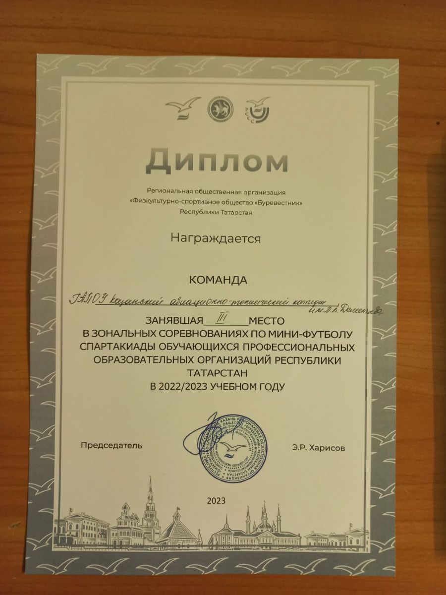 Опубликовано: 06.04.20236 апреля 2023 года наша футбольная команда заняла III место в зональных соревнованиях по мини-футболу Спартакиады обучающихся профессиональных образовательных организаций Республики Татарстан.