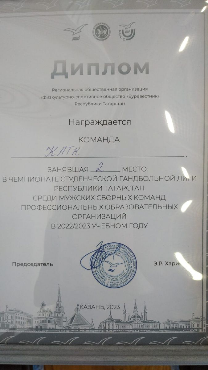 Опубликовано: 15.04.2023Команда КАТК заняла 2 место в чемпионате студенческой гандбольной лиги Республики Татарстан среди мужских сборных команд профессиональных образовательных организаций.