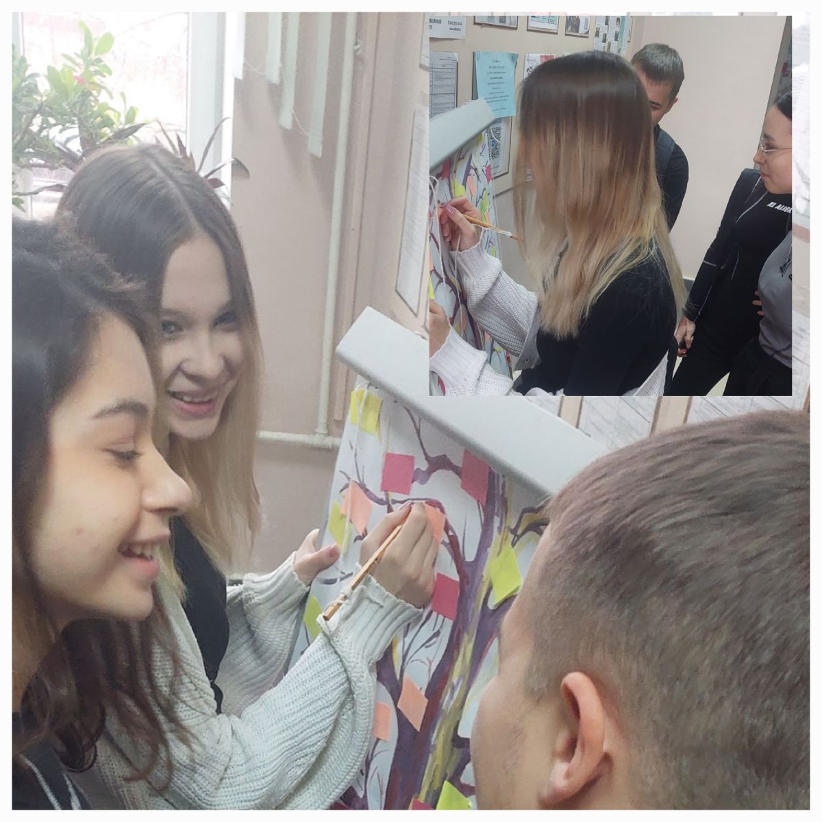 Для начала, мы сделали плакат с изображением дерева, на ветках приклеили яркие листочки изображающие, символизирующие наше желание. Разместили все это в главном холе колледжа, вместе с инструкцией к проведению акции. Всем участникам образовательного процесса было предложено на листочке написать свое желание. Студенты и педагоги с большим удовольствием приняли участие в акции, море позитива и теплых слов! Наше Дерево желаний быстро заполнилось листочками с пожеланиями.