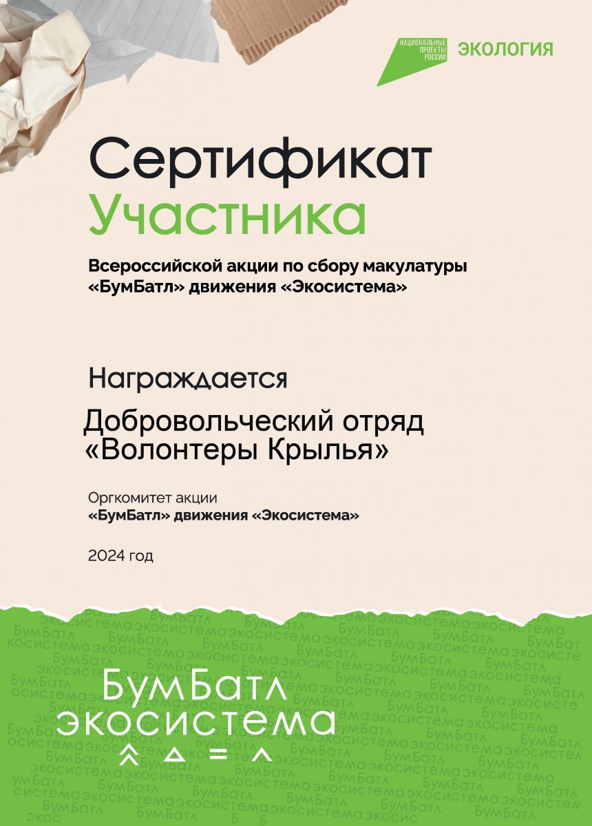Опубликовано: 14.11.2024Наши волонтеры участвуют во Всероссийской акции «БумБатл» по сбору макулатуры в поддержку национального проекта «Экология». Акция проходит под эгидой Всероссийского экологического общественного движения «Экосистема». Акция дает возможность проявить заботу о природе через сбор и сортировку бумаги. Но, как и любой батл, — это еще и соревнование по количеству собранной макулатуры, где можно побороться за первенство в командном зачете. Желаем удачи нашей команде!