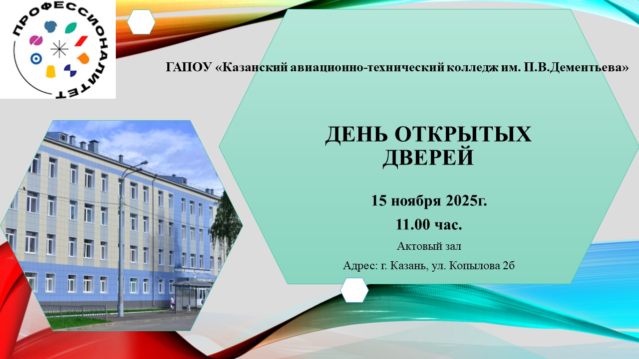 15 ноября в 11.00 ч. в ГАПОУ "Казанский авиационно-технический колледж им. П.В.Дементьева" в актовом зале колледжа, будет проводится День открытых дверей, по адресу: г. Казань, ул. Копылова, д. 2Б