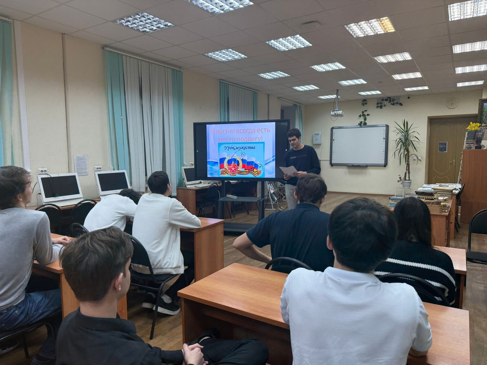 Советник директора провела для студентов Урок мужества «Подвиг во имя жизни»,с рассказом о конкретных примерах героизма сотрудников органах внутренних дел при исполнении служебных обязанностей.