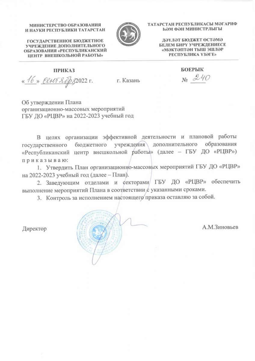 Приказ от 16.09.22 №240 Об утверждении Плана организационно-массовых мероприятий ГБУ ДО "РЦВР" на 2022-2023 учебный год, Приложение - План организационно-массовых мероприятий на 2022-2023 учебный год