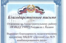 Отделение по Авиастроительному району ОГИБДД УМВД России г. Казани выразило благодарность педагогическому коллективу детского сада за участие в конкурсе рисунков среди воспитателей ДОО г. Казани "Безопасный путь домой".
