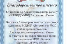 Педагогический коллектив детского сада награжден Благодарственным письмом Отделения по Авиастроительному району ОГИБДД УМВД России по г. Казани, за участие в конкурсе рисунков среди воспитанников ДОО г. Казани "Безопасный путь домой".