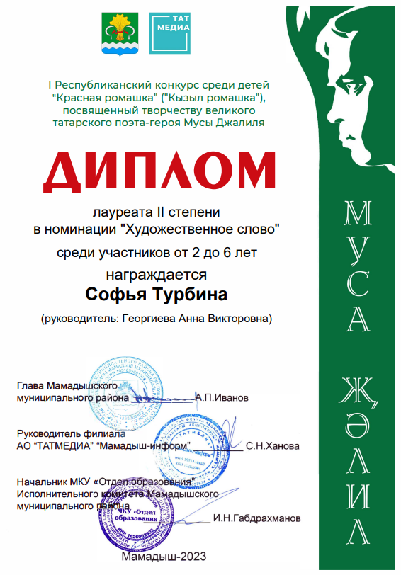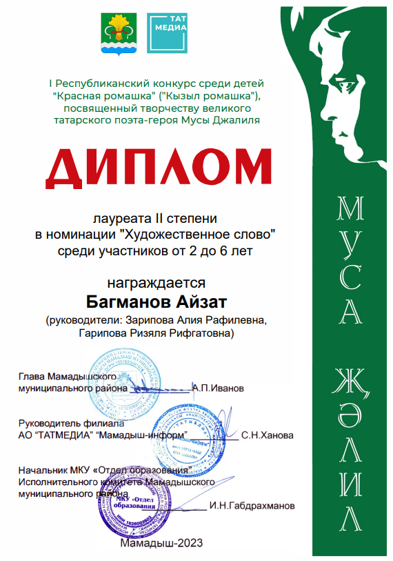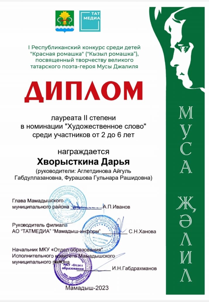 Так же приняли участие в I Республиканском конкурсе среди детей дошкольного и школьного возраста «Красная ромашка», посвящённого творчеству великого татарского поэта-героя Мусы Джалиля.