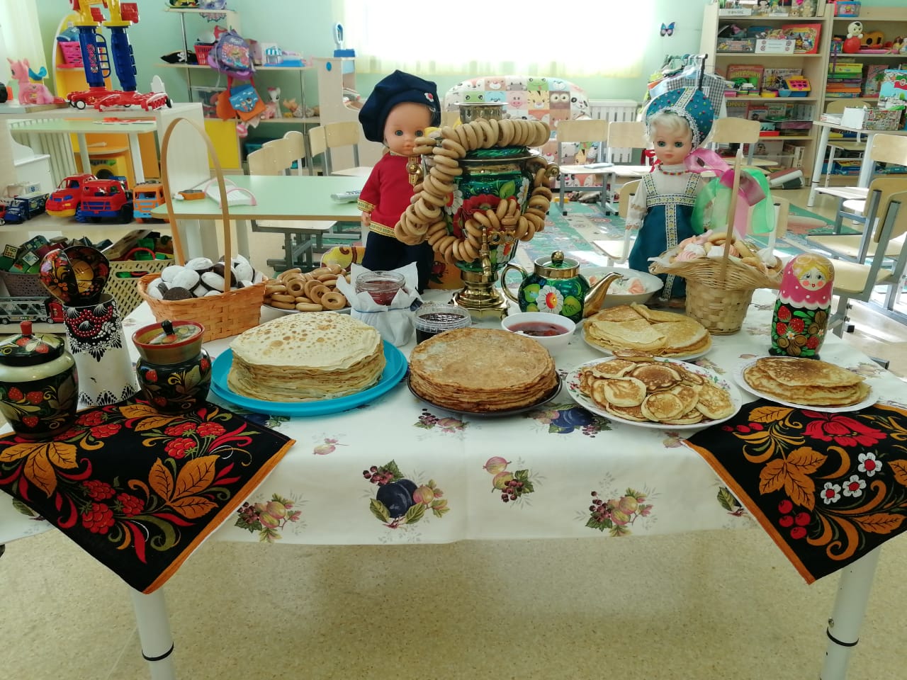 В нашем детском саду тоже состоялось празднование Масленицы. Веселую атмосферу празднику придавала музыка, от которой ноги плясали сами. Веселый скоморох праздника шутками да прибаутками призывал детей, веселиться от души и плясать, не жалея ног. Забавным персонажем на празднике была Хозяюшка и Весна-Красна. Они играли с детьми, участвовали в конкурсах, пели песни и водили хоровод. А блины, которые были главным угощением праздника - просто объеденье! Спасибо огромное нашим мамочкам! Кулинарные способности наших мам всех очень порадовали.