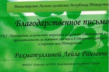 За активное участие в в X Открытом конкурсе "Сохраним леса Татарстана" наша коллега Рахматуллина Лейля Раилевна и ее воспитанники от Министерства Лесного хозяйства РТ получили Благодарственное письмо. Поздравляем!
