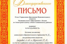 Наши звездочки 15.12.2016 Детский танцевальный коллектив нашего детского сада под руководством педагогов Сабировой Лианы Мансуровны и Щукиной Надежды Камилевны за участие в фестивале спортивных танцев получил Благодарственное письмо от Отдела Управления образования Исполнительного комитета Муниципального Образования г. Казани по Авиастроительному и Ново - Савиновскому районам. Молодцы!!!