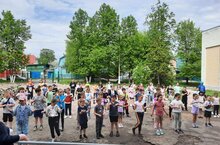 В пришкольном лагере "Солнышко" утренняя зарядка.