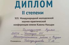 Гимназиянең 9 нчы сыйныф укучысы Хәмидуллина Азалия Галия Михеевна житәкчелегендэ Яшел Үзән шәһәрендэ уткәрелгэн К. Насыйри исемендәге фәнни-гамәли конференциядэ катнашып, ll дәрәҗә дипломга лаек булды. Котлыйбыз!!!