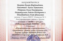Наши ученики 11а класса: Вахитов Булат, Давлетшин Рузаль, Рахматуллина Лейсан, Петряева Алиса , Шигабутдинов Азат участвовали в конкурсе научно-творческих работ "Нобелевские надежды КНИТУ-2017" и заняли 1 место в номинации "Плазмохимические и нанотехнологии". Выражаем благодарность ученикам и научному руководителю, учителю химии высшей квалификационной категории Хусаиновой Фирае Габдулнуровне. Молодцы!!!