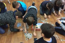 А вот так в лагере дети проводят свободное от мероприятий время. Все вместе собирают пазлы, рисуют, читают, общаются и знакомятся, заводят новых друзей.