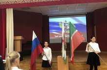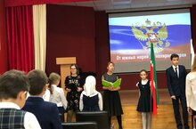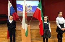 Честь вынести флаги была предоставлена ученикам 5А класса Мадировой Камиле и Салахову Фаилю, ученице 1А класса Абдуллиной Азалие