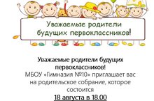 МБОУ «Гимназия №10» приглашает вас на родительское собрание, которое состоится 18 августа в 18.00( у кого готовы фотографии 3х4 в количестве 2штук и медицинская карта можете взять с собой)