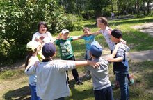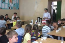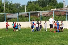 Сегодня наш летний пришкольный лагерь посетил тренер футбольной команды "Импульс". Он провел спортивную игру-футбол "Кожаный мяч" на свежем воздухе. Мальчики с интересом участвовали в этой игре. У некоторых появилось желанием заниматься футболом. А девочки в это время играли в различные игры и поддерживали свой отряд.