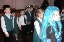 Ребята 4 А класса подготовили и провели новогодний праздник «Новогодняя сказка о добре и зле» для учеников 1 Б класса и ГПД. Дети подготовили костюмы, конкурсы, песни, танцы. А Снегурочка (Валиева Наиля) принесла подарки.