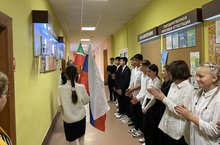 Традиционно утро понедельника начинается с выноса флагов Российской Федерации и Республики Татарстан и исполнения гимнов. На этой неделе право вынести флаги предоставилось 8В классу.