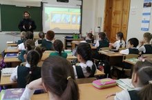 Ведущий специалист отдела профилактики ГБУ "БДД" Газизова Айгуль Зуфаровна провела профилактическую беседу по БДД и применению СВЭ в тёмное время суток с учащимися 2х классов.