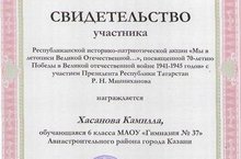 Поздравляем ученицу 6 б класса Хасанову Камиллу с наградой за участие в Республиканской историко-патриотической акции "Мы в летописи Великой Отечественной...", посвященной 70-летию Победы в Великой Отечественной войне 1941-1945 годов с участием Президента Республики Татарстан Р.Н.Минниханова.