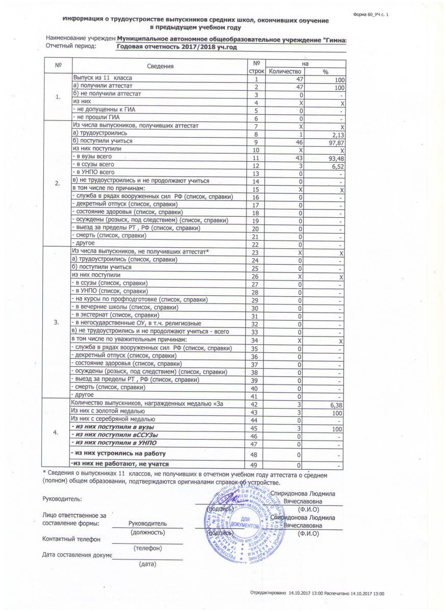 Информация о трудоустройстве выпускников. Годовая отчетность 2017/2018 уч.год