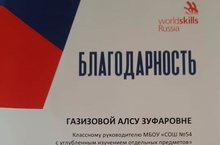 Классному руководителю 9В класса Газиевой Алсу Зуфаровне выражает благодарность «Worldskills Russia» за большой вклад в организацию регионального чемпионата «Молодые профессионалы» Республики Татарстан чемпионатного цикла 2021/2022 г.