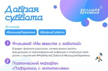 Участники Всероссийского конкурса для школьников «Большая перемена» – проекта президентской платформы «Россия – страна возможностей» – в рамках еженедельной акции «Добрая суббота» присоединятся к проекту Всероссийской акции взаимопомощи #МыВместе по информированию граждан о вакцинации от коронавирусной инфекции.