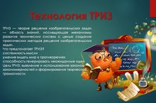 Творческая группа педагогов:Шевченко С.В. ,Савина Е.Е., Ахмерова И.Р., Матяшина Е.Н., Ахтямова Г.Х., Иванычева Н.А. предложили педагогам методические советы по работе с ТРИЗ-технологией, провели практическую часть , предложив своим коллегам приемы и упражнения данной технологии: « да-нет», « хорошо- плохо»,« морфологический ящик», « раскадровка», « шаг за шагом», « лИмерик» , «хронолет», « лови ошибку»и др. Данные приемы позволяют активизировать воображение обучающихся , создать творческую обстановку , при которой происходит совместная работа учителя с учащимися , возникает общее переживание –действо, что также создает эмоциональное отношение к изучаемому предмету.
