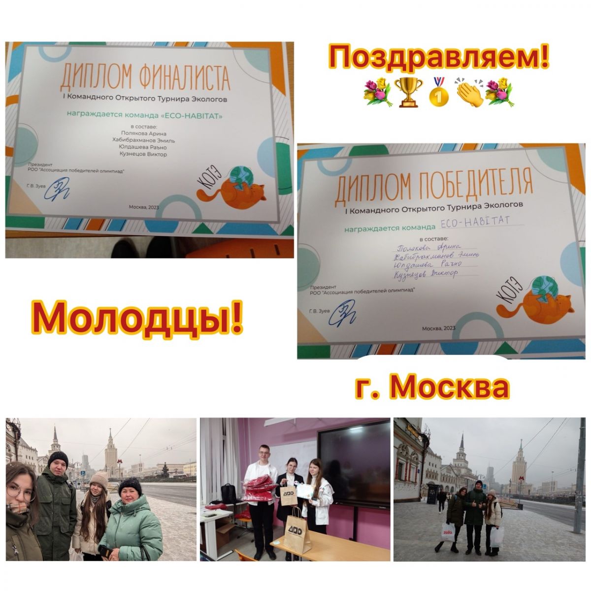 19.11.2023г. в Москве на базе общеобразовательной школы центра педагогического мастерства РФ состоялся I Командный Открытый Турнир Экологов. Учитель биологии и химии Туманова Наталия Юрьевна и команда старшеклассников «ЕCO- NABITAT» в составе Поляковой Арины, Хабибрахманова Эмиля, Юлдашевой Раъяно, Кузнецова Виктора заняли 1 место в I Открытом Турнире Экологов.